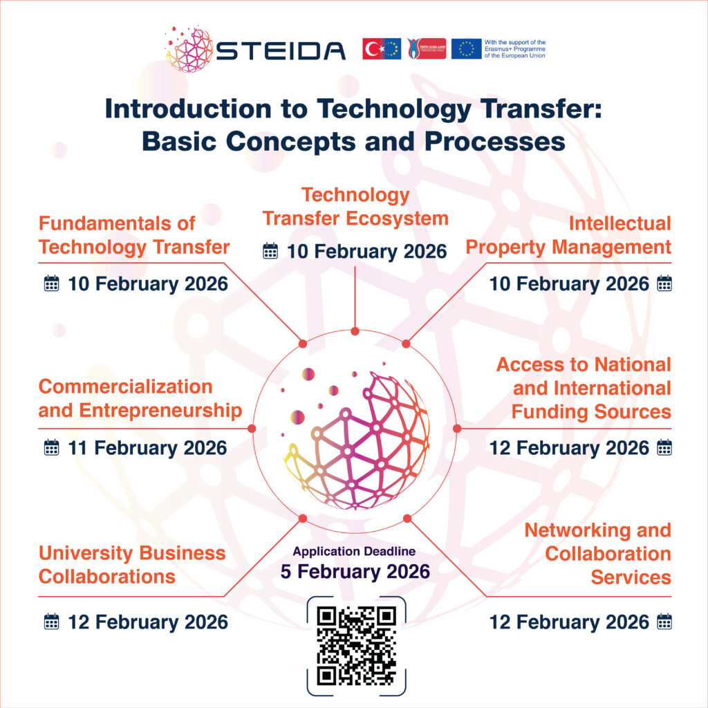 Applications are now open for the “Introduction to Technology Transfer: Basic Concepts and Processes” Training Program The training program titled “Introduction to Technology Transfer: Basic Concepts and Processes” developed within the scope of the STEIDA – Strengthening the Technology Transfer Ecosystem with Innovative and Digital Approaches Project, which is implemented by the Technology Transfer Application and […]